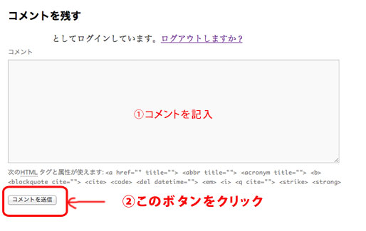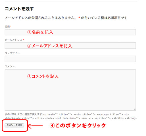 すると「コメント」を記載できる投稿ページに推移しますので、必須項目(名前、メールアドレスを記載し、コメントを書き、「コメントを送信」ボタンをクリックしてください。これで完了です。